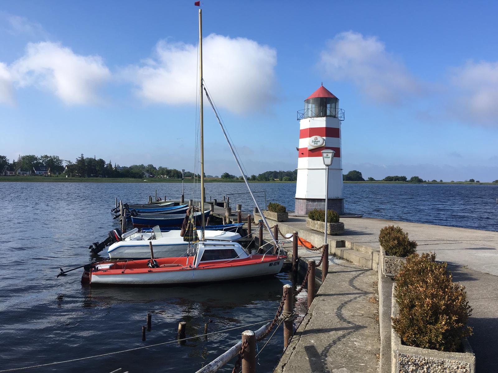 Zur Beruhigung putze ich einfach erst mal, lenke mein Boot mit Puls 180 die ersten Meter über unseren Stausee und bin erstaunt, wie unkompliziert es sich ein paar Wochen später auf einem Anhänger die 400 Kilometer nach Ribnitz-Damgarten ziehen lässt. Außer einem Schäkel für die Want geht nichts verloren und kaum sind wir am westlichsten Hafen des geschützten Ostseeboddens angelangt, werden wir von der freundlichen Seglergemeinde aufgenommen. Ein Familienvater beäugt interessiert die kleine Nussschale auf dem Trailer und fragt, ob wir da zu zweit drauf fahren wollen. Ja klar! Nun kneift er die Augen zusammen und erzählt uns, dass er eine Woche mit seinem doppelt so großen Boot im Hafen „abgewettert hat“, die Wellen auf dem Bodden 1,50 Meter hoch waren und wir besser nichts mitnehmen sollten um Platz und Gewicht zu sparen. Lieber erst mal in Ribnitz bleiben und ein paar Probeschläge fahren, empfiehlt er uns. Halleluja, wir sind in unserem Leben keine 10 Seemeilen ohne Segellehrer gefahren und die Ratschläge lassen mein seemännisches Selbstvertrauen welken wie eine Zimmerpflanze in frostiger Nacht. Egal, wir dürfen die Sliprampe gratis benutzen, kein Hafenmeister weit und breit, den wir wegen einer Übernachtung fragen könnten und so takeln wir auf und machen einen Kurztrip zu Fuß durch die hübsche kleine Stadt in Mecklenburg um einen Plan zu fassen. Es ist erst 16 Uhr, 1,50 Meter hohe Wellen sind nicht zu sehen und der nächste Hafen in Althagen müsste eigentlich in Sichtweite sein. Wir lassen Auto und Trailer neben einer wenig vertrauenswürdigen Halle am Hafen zurück und schließen die Batterie an den Elektromotor an, der uns die 30 Meter aus dem Hafenbecken in den grünen Bodden schiebt - unser Revier für die nächsten knapp drei Wochen.